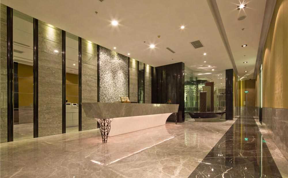 酒店的大堂是對外傳送信息最為重要的第一印象,在大堂的空間設計上,二層的中空是在舊樓外加建而成,完美的解決了因原建筑首層樓層低所造成的問題,在大堂的室內設計中,選用了意大利黑金花石材與皮質材料相結合,低調中彰顯貴氣,高雅中追求人文色彩。后期室內裝飾品的點綴讓人感覺更為親近和舒心,整體氛圍與設計中“以人為本”的理念相協調。大堂中空的中式藝術豪華吊燈精致,就像一串流動的珍珠,更突顯了酒店的大氣與靈動。